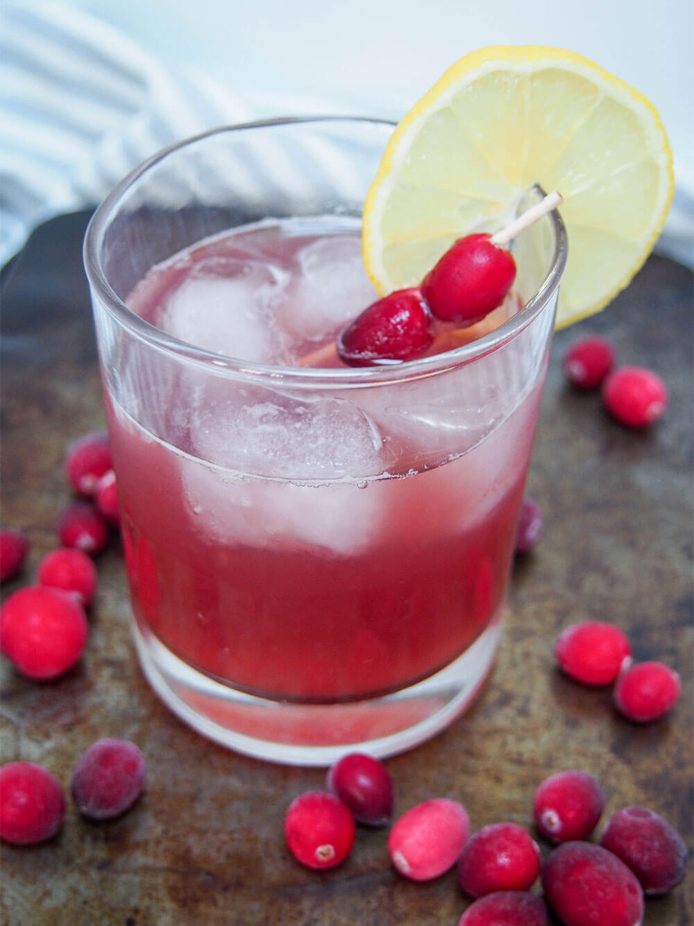 Put everything in a cocktail mixer along with a few ice cubes. Cover and shake well. Either pour into a glass as it is, or serve over ice (suggest in an old fashioned class). I'd suggest a slice of lemon and some frozen cranberries as garnish.